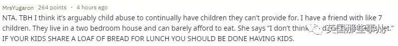 “你不是混蛋。说实话,我觉得无力供养又偏要生,这可以算是虐待儿童了。我认识一个朋友,生了大概7个孩子。他们住的房子只有两个卧室,甚至连吃的都买不起。她说,‘我觉得自己还要生。’假如你的几个孩子只能分享一块面包当午餐,那你就不应该继续生了。”