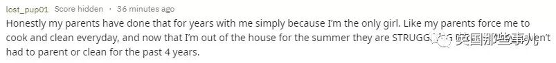 也有网友讲述了自己的类似经历或听说过的故事。 “过去几年当中,我父母也一直这样对我,原因很简单——我是家里唯一的女孩。他们逼着我做饭洗衣,每天都是如此。今年夏天我搬出去了,这下他们可忙坏了,因为过去四年当中,他们从未照顾过孩子,也没做过家务。”