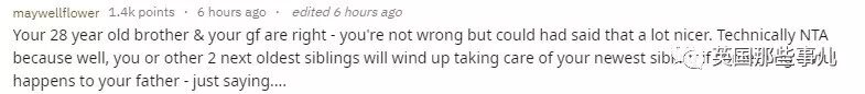 “你28岁的弟弟和你女朋友说得很对——你没做错,但你说话的方式可以更缓和。你不是一个混蛋,因为假如你的父亲出现意外(我只是说假如),你或者另外两个比较大的孩子就得负责照顾这个刚出生的婴儿……”