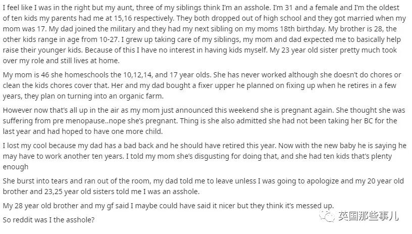 (示意图) 而且,妈妈虽然是全职主妇,但家务事上并不利索,甚至还有些懒惰。所以,很多乱七八糟的家务都落到了懂事的长女身上。 刷不完的奶瓶,换不完的纸尿裤,永远乱糟糟的家,永远有小孩子哭哭啼啼需要照顾…… 有时候,眼看弟弟妹妹快要长大,自己终于要解脱,小姐姐心里一阵欣喜,妈妈却吧唧一下,又生出来一个需要照顾的娃…… 这些年来,小姐姐心里的压抑和苦闷可想可知。 如今,这位31岁的小姐姐已经搬出父母家,独自居住,但家里很多事情依旧要她操心。 并且,她走了事儿还在,如今,照顾未成年弟弟妹妹的责任又落到了她23岁的妹妹身上。 眼看正处于大好青春的妹妹走上了和自己一样的道路,在照顾孩子、整理家务中虚度时光,小姐姐心里非常不是滋味儿。 这种日子,什么时候才是个头呢…… 上个周末,她妈妈欢天喜地地宣布了一个“好消息”: “我又双叒叕怀孕啦,你们要有一个小弟弟/小妹妹了!” ……………… ……………… ……………… 小姐姐心里非常无语,要知道,她妈妈已经46岁,完完全全的高龄产妇。 而且,这个孩子居然是她计划之内的——母亲说,自己早就想再生一个,所以从去年就没有吃避孕药了。 父亲因为身体不好,老是背疼,所以早就计划今年退休,自己搞个有机农场安享晚年。突然又多了一个嗷嗷待哺的孩子,父亲掐指一算,自己起码还得再工作十年。 更让人生气的是,她已经生了10个孩子,自己根本没怎么照顾,基本都推给了年龄较大的女儿,现在又要生,生了又不管…… 小姐姐心里积压的委屈和怒火蹭蹭蹭地往上冒,她忍不住对妈妈说道,“你已经有10个孩子了,够了!这样不负责任地乱生真的很让人恶心!!” 原本欢天喜地等着接受大家祝福的妈妈被女儿的一通怒火弄傻了眼,眼泪当时就落下来,然后委屈地冲出家门。 小姐姐的爸爸、20岁的弟弟,23岁和25岁的妹妹都觉得她做错了。只有一个28岁的弟弟和小姐姐的女朋友站在她这边,觉得她的想法没错,但说话的方式可以更委婉一些。 小姐姐既生气又委屈,忍不住在网上发帖,“请问我这样做真的是个混蛋吗?”