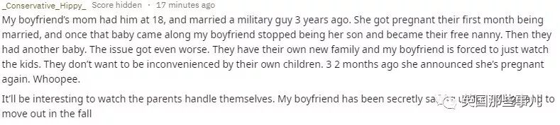 “我男朋友的妈妈在18岁那年生下了他。三年前,他妈妈和一个军人结婚了。结婚才一个月,她就怀上了孩子。孩子落地之后,我男友的身份就从她的儿子变成了他们一家的免费保姆。之后,他妈妈又生了一个孩子,情况越发严重。他们组成新家庭,男友被迫帮忙照顾孩子。而他们,根本不想因为孩子的存在对自己造成任何不便。两个月之前,她又双叒宣布自己怀孕…… 很期待他们手忙脚乱自己照顾孩子的样子。我男友已经在悄悄攒钱,以备今年秋天上大学后搬出去住了。”