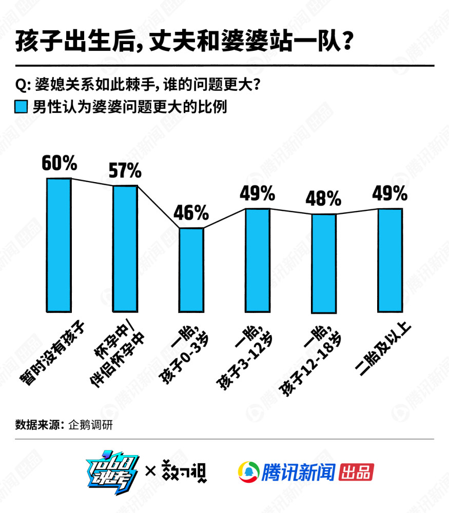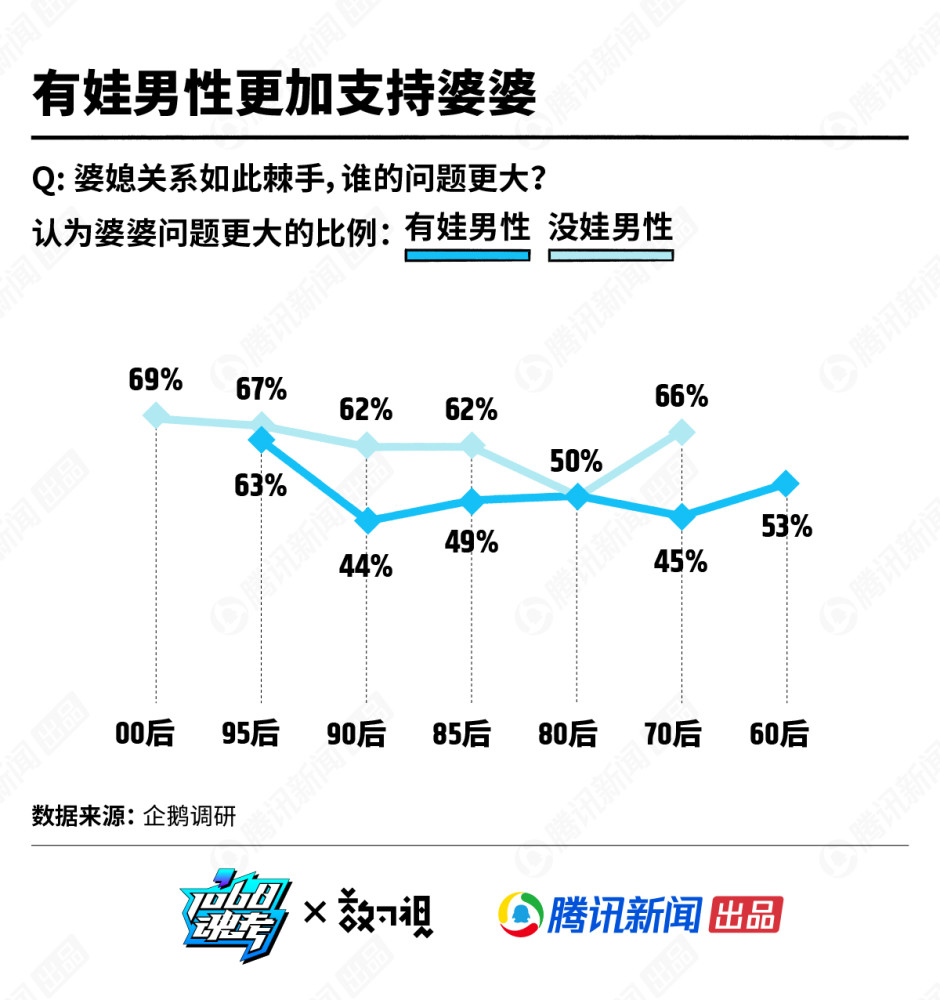 数据显示,各年龄段有娃的男性都比没娃的更支持婆婆。特别是有娃的90后们,选择错在婆婆的比例不足一半,仅为44%。