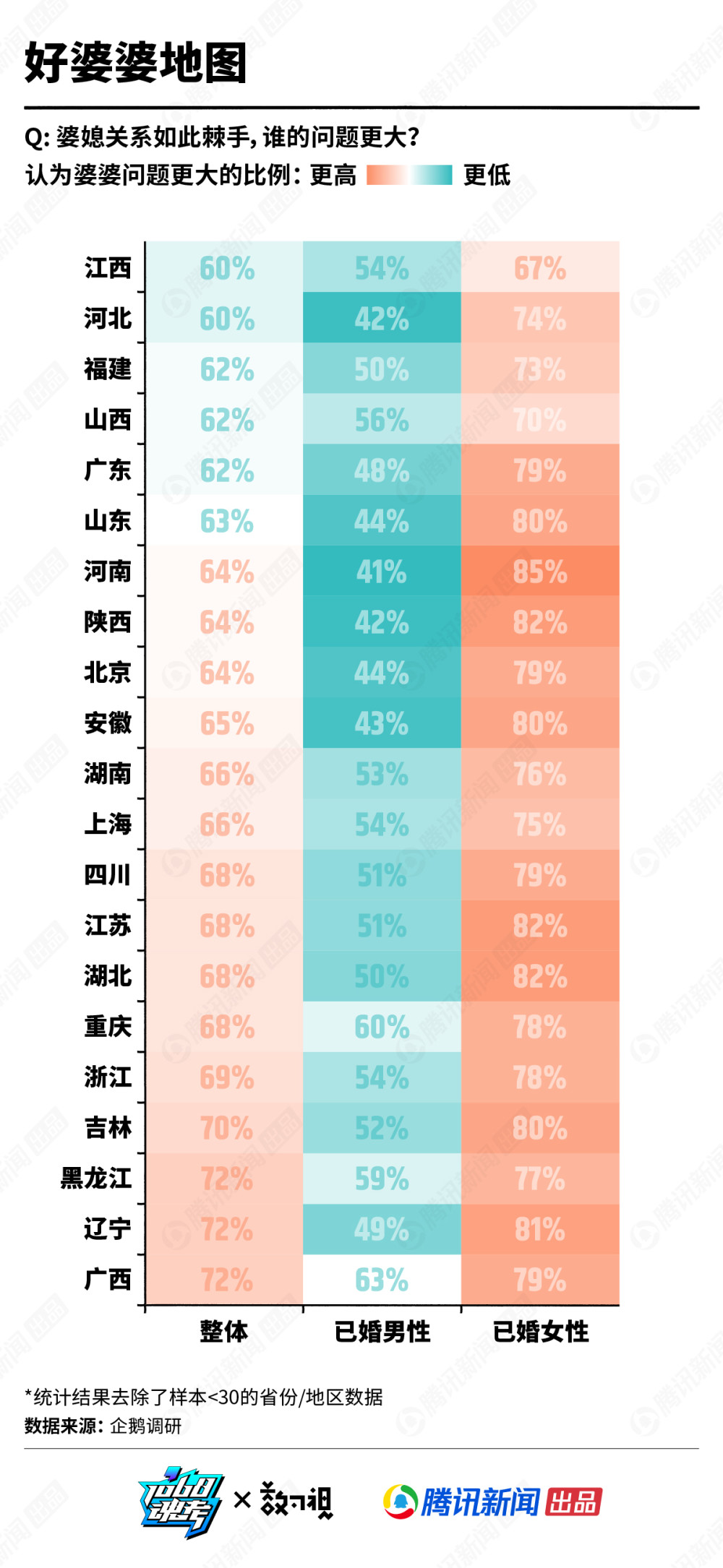 那么,哪里的老公最向着妻子?哪里的媳妇更容易从自身找问题?下面是我们制作的“好婆婆地图”,单身狗们快擦亮眼往下看!