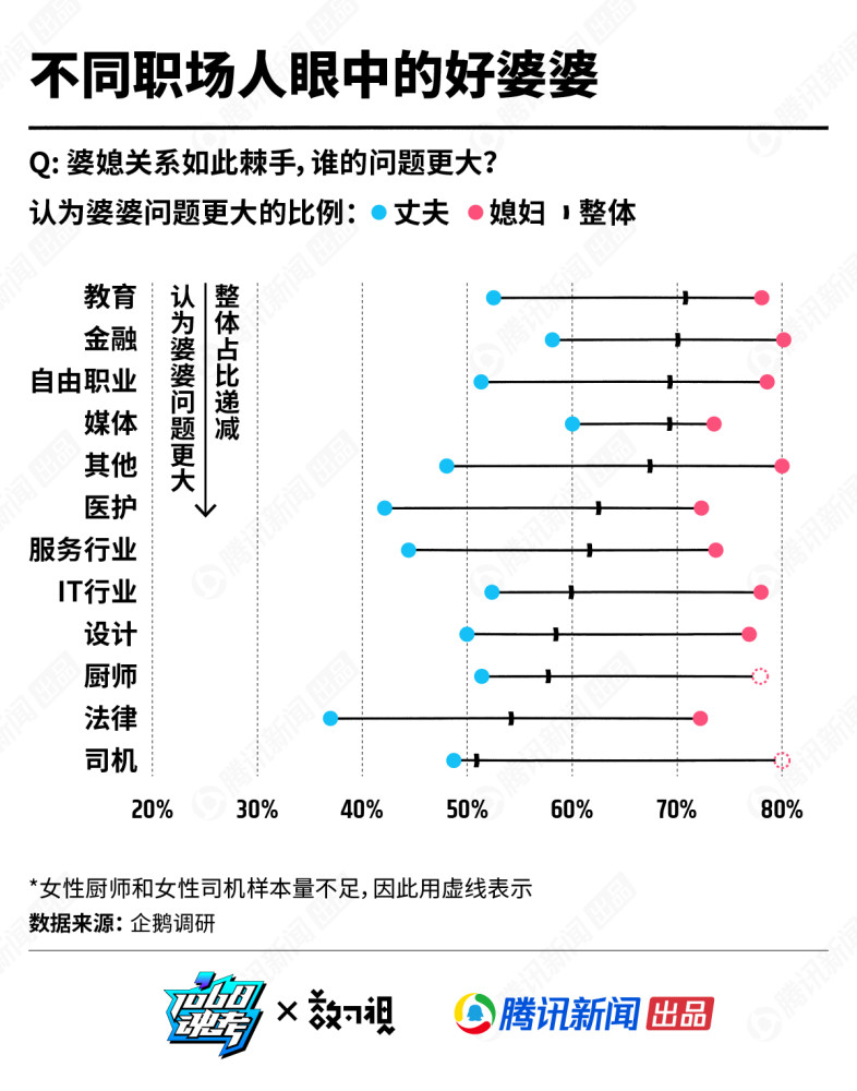 法律行业的女性也一样体谅婆婆,她们选择问题在婆婆的比例最低,为72%。