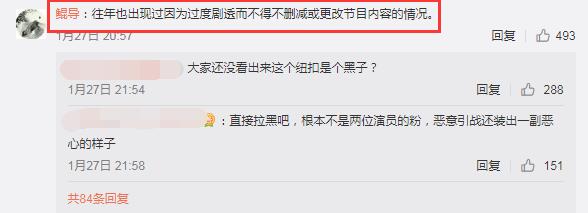 随后,鲲导又在留言区补充称:“往年也出现过因为过度剧透而不得不删减或更改节目内容的情况”,如果节目被过度剧透,鲲导表示不排除删剪或者更改节目内容。