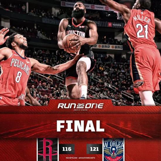 主场116-121不敌鹈鹕,火箭输了比赛,但巩固了联盟第一送温暖大队的头衔。