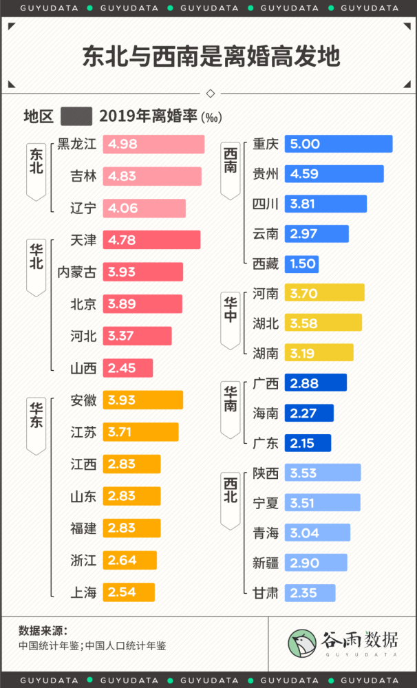 全国离婚地图 谁选择了离婚?他们为何选择?背后的心态如何?我们尝试勾勒出一幅关于离婚的群像。 离婚率有明显的地域差异。比如,仅看2019年的离婚率数据,会发现东北与西南省市是离婚的高发地区。 西南以重庆和贵州为代表,其中,重庆以5‰的比例位列全国第一。也就是当年每一千人中,就有五对夫妇离婚。 同时可见,东北三省整体排名靠前。 反观华南、华东地区的沿海省市,则整体处于低水平,如福建、浙江、上海与广东,保持在2.5‰上下,约为重庆数值的一半。