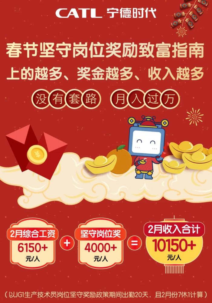 前两日,宁德时代招聘中心也发布春节留岗奖励政策,鼓励员工春节假期能留在工厂上班,并给出4000元以上奖励,加上综合工资,2月份收入达到万元以上。除了富士康和宁德时代,其他工厂应该也有相应的奖励政策,不过金额会有一定差异。